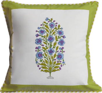 As an avid gardener, botanical illustrations are always so pleasing to my eye. This pillow features a botanical study. Expertly block-printed by an eighth generation family of artisans in Jaipur, the artisans are stewards of a craft that has been passed down to them generation after generation. From the master block makers who carve the blocks in a village to the hands that print the cloth, there are many hands that go into making each piece. By selecting this handmade piece, you contribute to reviving craft and supporting artisan communities. Thank you for supporting our artisans. Material: 100% Cotton Dimensions: 18" x 18" inches
