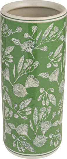 Bring a touch of elegance to your entryway with this 18" Green Ceramic Umbrella Stand, featuring a beautiful floral motif. Crafted from durable ceramic, this stand not only offers a functional place to store your umbrellas but also serves as a decorative accent in your home. The vibrant green finish and intricate floral design evoke a sense of timeless artistry, making it a standout piece. Perfect for adding a pop of color and style to your foyer or hallway, this umbrella stand blends both practicality and beauty.