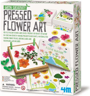 4M: PRESSED FLOWER ART - Explore the wonders of the natural world with the Pressed Flower Art Kit! This educational and engaging kit allows children to create their own pressed flower art pieces, providing endless hours of entertainment and creativity. It includes all the necessary materials, such as a flower press measuring 4 x 4 inches, paper, and frames, enabling young artists to craft beautiful and unique designs. With detailed instructions guiding them through the process, kids will find it easy and enjoyable to explore their artistic talents. Ideal for school projects, arts and crafts, or simply as a fun activity at home, this hands-on project enhances creativity while teaching the principles of botany and art. Inspire a love for nature with this innovative and interactive kit, which encourages children to recycle fallen flowers and leaves. They can preserve the beauty of nature in their own homes by making pressed flower crafts like trinket boxes, greeting cards, and bookmarks. The Pressed Flower Art Kit is a fantastic way to combine fun and learning, making it an excellent gift for young nature enthusiasts! INCLUDES: Flower press cover and base (10cm X 10cm), corrugated cardboards, white blotting paper, plastic screws and wing-nuts, trinket boxes, cards, envelops, bookmarks, brush, glue, ribbon, double-sided adhesive tapes and detailed instructions.