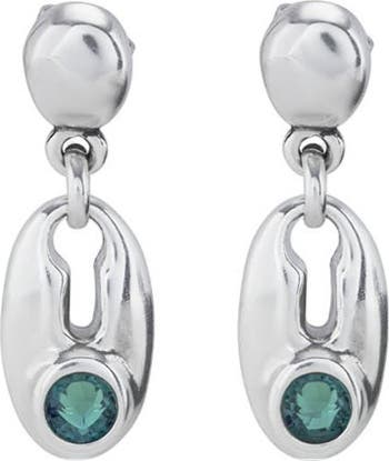 Slender sterling silver-plated drops showcase a faceted green crystal for a fresh, vivid finish.