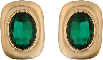 Faceted green cubic zirconia radiate color from the center of these square stud earrings plated in glowing 14-karat gold.