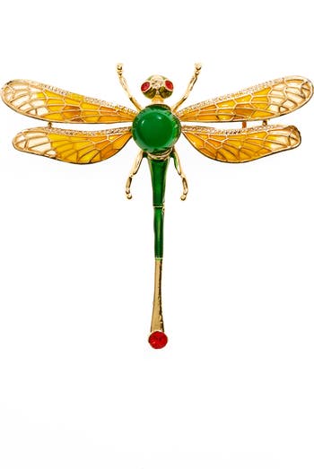 Show off whimsical shine with this highly polished dragonfly pin enriched by colorful enamel and sparkling crystals.
