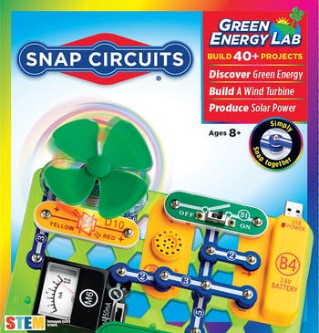 SNAP CIRCUITS GREEN ENERGY LAB STEM Toy teaches modern energy conservation in a FUN and hands-on way. Build 44 exciting STEM based projects and learn about clean energy concepts like alternative power including, solar, wind and hydro. Green Energy LAB teaches the basics of electronics and how electricity in our evolving world works. Color-coded instruction manual with step-by-step directions. GEEN ENERGY LAB is a GREAT GIFT for ages 8+, give the gift of learning and fun! Snap Circuits kits will keep children busy and having fun all year round. Combine with other Snap Circuits kits for even more projects! Hands on electronic learning for children ages 8+.