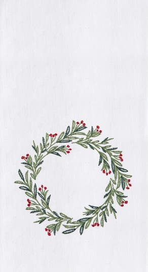 Green Holly with Red Berries Wreath Holiday Christmas Xmas Embroidered Flour Sack Kitchen Towel 27L x 18W in.