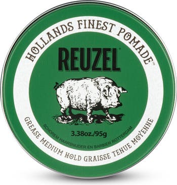 REUZEL® Green Pomade Grease, formulated with beeswax, allows product to glide through the hair without clumping, while encouraging moisture retention. This product is NOT water soluble. SHINE: 5/10 HOLD: 5/10