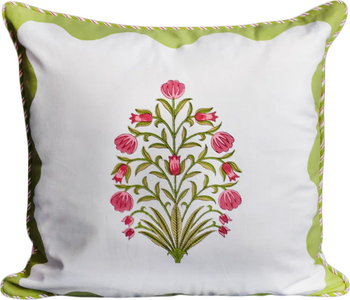 With a whimsical, wavy scallop border and a lovely floral centerpiece, this pillow is a vibrant addition to the home. Expertly block-printed by an eighth generation family of artisans in Jaipur, the artisans are stewards of a craft that has been passed down to them generation after generation. From the master block makers who carve the blocks in a village to the hands that print the cloth, there are many hands that go into making each piece. By selecting this handmade piece, you contribute to reviving craft and supporting artisan communities. Thank you for supporting our artisans. Material: 100% Cotton Dimensions: 18" x 18" inches
