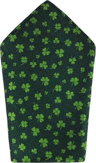 The Green Shamrock Collection is a modern twist on the traditional shamrock design. Woven on a dark green base silk, the different shapes of the shamrocks almost give off a metallic look, which will make this pocket square pop in any outfit. Elevate your look with the gorgeous pocket square that shows off your Irish pride, your luck of the Irish, or just your overall like for shamrocks with this dapper pocket square. Pairs perfectly with assorted colors of suits and tuxedos, along with khakis and jeans for a night out. Pocket square measures 12 inches by 12 inches.