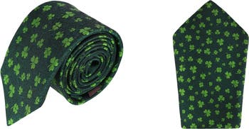 Elevate your style with the Green Shamrock Novelty Silk Pocket Square and Necktie Bundle, featuring a modern twist on traditional shamrock patterns. Crafted from dark green silk, both pieces showcase metallic-like shamrock designs that add a touch of sophistication and charm to any outfit. Perfect for St. Patrick's Day or year-round wear, this stylish duo complements a variety of suits and casual attire, making it a versatile addition to your wardrobe.