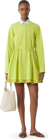 This short shirt dress is made from cotton with a very pleasant feel that perfectly enhances the cut, ideal for mid-season daytime wear. The asymmetrical cuffs represent Jeanne Lanvin's initials, with a rounded side for the J and a square side for the L. The embroidered ribbon on the back echoes one of the House's signatures and pays tribute to the grosgrain ribbons used by Jeanne Lanvin to finish the interior of her Haute Couture dresses and embellish her embroidery. The topstitched details are also inspired by the archives, recalling an embroidery technique used to structure the silhouette.