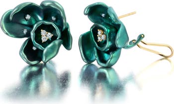 Gemstone: .25cts of G-H Color White Diamonds (14pcs) Metal: 18K Gold, 1.3 Grams & Titanium, 6g Colors: Yellow Gold & Green Titanium Measurements: 20.5mm Closure: Post & Omega