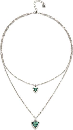 - Sterling silver plated metal alloy necklace with double chain and green crystal triangle
