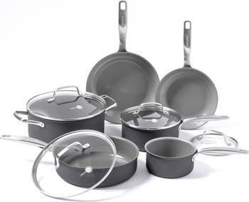 Designed to stand up to the daily demands of your kitchen, Chatham is constructed from hard anodized aluminum for maximum strength and scratch protection. The set features a healthy ceramic nonstick that's reinforced with diamonds for extra durability. Cookware Set Includes: 1QT and 2QT saucepans with lids, 5QT casserole with lid, 8" and 9" frypans, and 3QT skillet with lid. GreenPan’s Thermolon healthy ceramic nonstick coating is free of PFAS, PFOA, lead, and cadmium, so it will never release toxic fumes, even if it’s accidentally overheated. Metal utensil safe, this collection's diamond-reinforced coating is incredibly durable. Tough hard anodized bodies are scratch-resistant and designed to stand up to daily demands. Oven and broiler safe up to 600°F. Dishwasher safe for easy cleanup. Durable glass lid for easy food monitoring, oven safe up to 425°F. Matte stainless steel handles feature a riveted, ergonomic design for a secure and comfortable grip. Suitable for all stovetops except induction. Limited lifetime warranty.