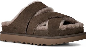 The perfect hybrid of a slipper and sandal, this strappy slide is made from soft suede and lined in genuine shearling for an ultracozy feel.