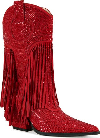 Glistening rhinestones and swingy fringe add occasion-ready opulence to a pointy-toe Western boot lifted by an inverted block heel for dancefloor-worthy height.