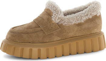 Genuine-shearling lining amplifies the cozy style of a smooth suede loafer grounded by a dynamic platform sole.