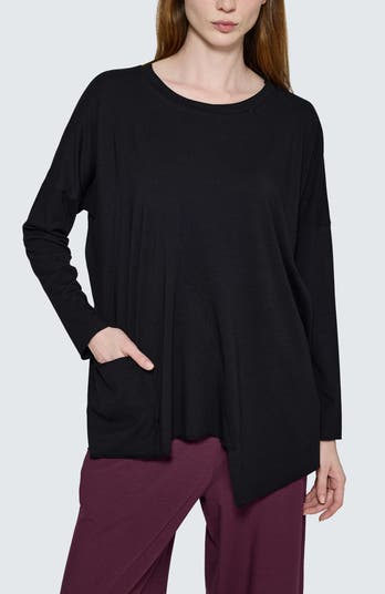 A versatile blouse crafted from soft cotton jersey, featuring a relaxed comfort-fit T-silhouette, round neckline, long drop-shoulder sleeves, and a dynamic asymmetrical hem.