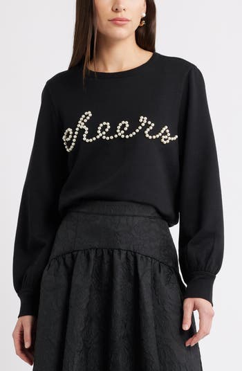 Ready for every toast on your calendar, this plush sweatshirt frames the body in smooth fleece then rounds into sculptural balloon sleeves with a gentle billow. Across the front, tiny imitation pearls sketch 'cheers' in playful cursive so the vibe reads celebratory yet completely wearable.