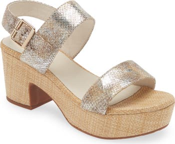 A raffia-covered platform and heel add earthy texture to a stylish sandal perfect for any day-to-night look.