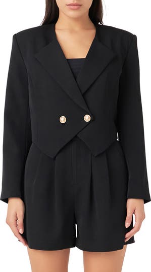 Gleaming goldtone buttons punctuate the front of a waistcoat-inspired blazer boasting sharp lapels and a modern cropped silhouette.