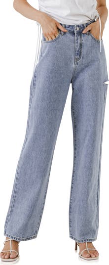 A soaring waist brings flattering shape to these loose-fitting jeans that sport a single cutout detail and long, cuff-ready hems.