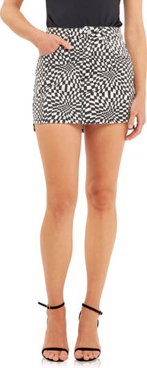 An entrancing warped checkerboard print adorns this flirty and fabulous denim miniskirt.
