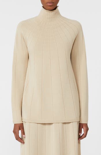Wide ribbing lends subtle texture to a funnel-neck sweater made from soft and cozy wool.