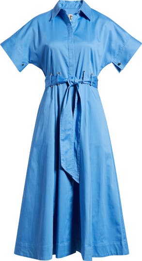 Cut from crisp stretch poplin, this midi shirtdress is updated with abbreviated sleeves and detailed with grommet-trimmed loops to anchor the tie belt.