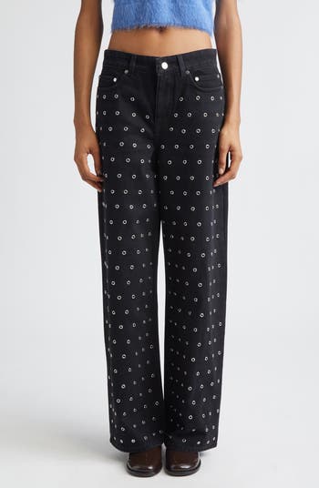 For fall '25, the New York design duo brings a darker, moodier edge to their typical deconstruction. One result: these slouchy straight-leg jeans cut from nonstretch denim punctured with silvery grommets that reveal peekaboo flashes of skin.