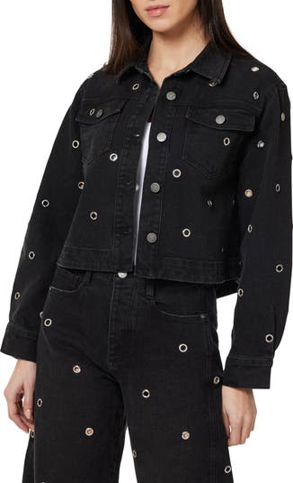 Silvertone grommets punctuate this stretch-added denim trucker jacket with a look of edgy glamour.