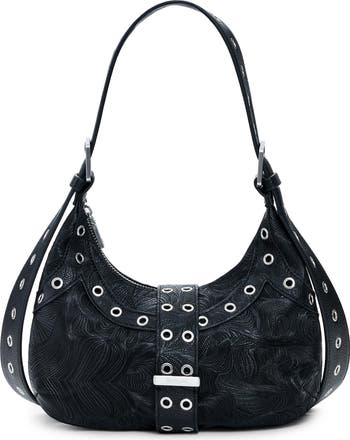 Intricate embossing and polished grommet hardware amplify the modern sophistication of this must-have shoulder bag.