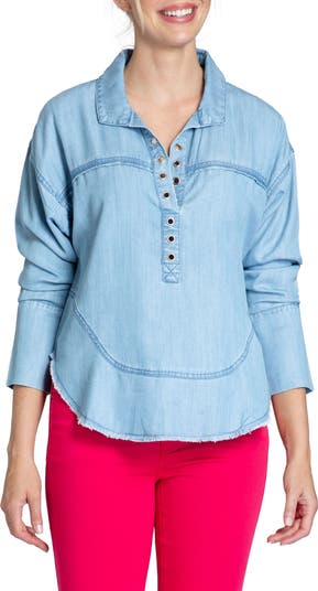A twist on the classic chambray shirt, this collared version stands out with a grommeted henley placket, curved seams and a frayed high-low hem.