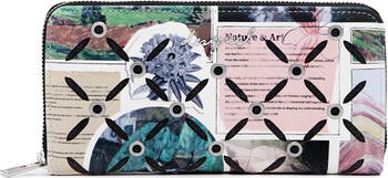 Shiny grommets highlight the patchwork-inspired exterior of a zip wallet organized with an array of pockets perfect for storing your cards, cash and coins.