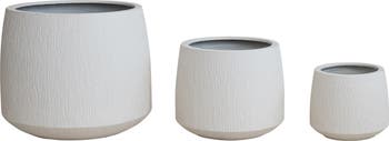 Add airy texture and layered greenery with this Set of 3 White Grooved Eco Stone Planters, crafted to bring fresh style indoors or out. Each piece features a classic round shape with sculpted grooves and a clean white finish, offering visual interest while keeping the look soft and relaxed. Designed in three sizes, these planters create depth when styled together or can be spread throughout a space for a cohesive feel. Made of lightweight magnesia and clay, they are easy to move and built to last. The largest measures 21.5 inches in diameter and 17.5 inches in height, the medium measures 15.5 inches in diameter and 12.5 inches in height, and the smallest measures 11 inches in diameter and 9.25 inches in height. These planters make any space feel lighter, brighter, and full of life.