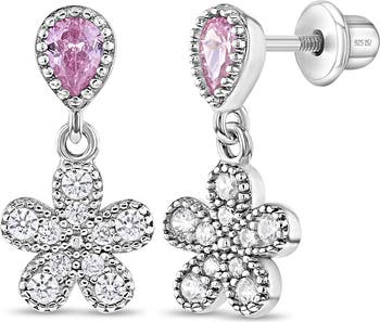 Beautiful dangle flower drop earrings are perfect for the girl in your life. The pale pink CZ teardrop shape holds the sterling silver and clear cubic zirconia flower earrings at just the right height for some sparkle. Finely crafted entirely in 925 sterling silver and cubic zirconia stones, they are hypoallergenic and safe for children with sensitive ears.They feature a threaded earring post and back to ensure your child's earrings stay safely and comfortably in place. A complimentary gift box is included.