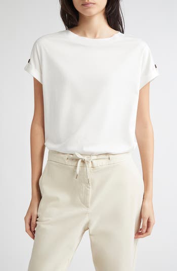 This short-sleeve T-shirt turns simplicity into a statement, imagined from a silky lyocell-cotton blend that virtually pours over the body. Grosgrain accents at the dolman-style short-sleeve cuffs bring textural contrast and utilitarian allure.