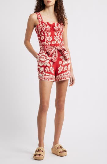 Vacation is calling in this breezy linen-blend romper covered in lively print and centered with a defining tie belt.