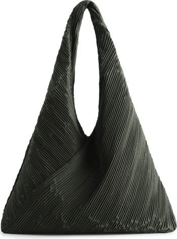 This chic shopper in softly folded triangular silhouette adds artistic cachet to toting essentials.
