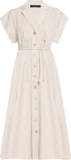 This long linen dress offers understated sophistication with a polished silhouette. Designed with short sleeves and tailored details, it combines the breathable comfort of linen with an elevated, structured fit. Perfect for warm-weather gatherings, workdays, or elegant daytime events, this piece transitions seamlessly from casual to refined settings.