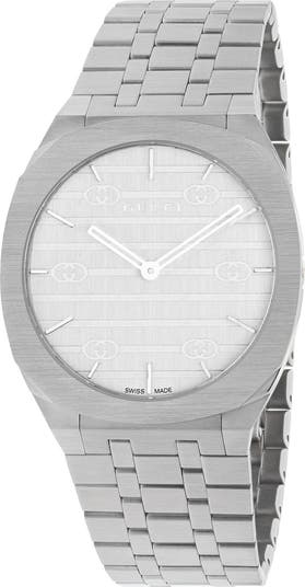 Named for one of creative director Alessandro Michele's favorite numbers, this brushed-steel watch launches Gucci's latest foray into luxury sports watches. The look is sharp, clean and monochromatic with a flat bezel, integrated bracelet and hidden crown, while trademark double Gs interrupt the etched horizontal stripes on the dial.
