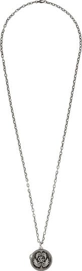 A serpent-encircled pendant featuring the double-G logo is suspended from an antiqued sterling silver chain detailed with textured links.