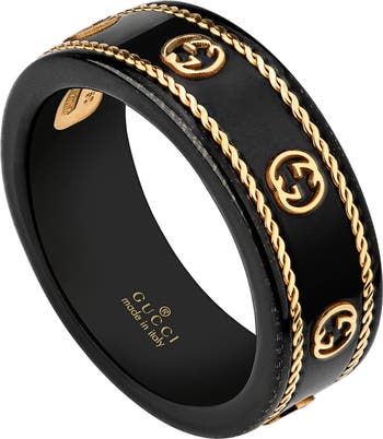 Put a lot of wow in a small gift package with this synthetic black corundum ring featuring the interlocking-G logo and braided borders plated in 18-karat gold.