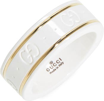 The emblematic double-G motif is embossed in this opulent white zirconia ring that's enriched by 18-karat gold trim for a subtle contrast.