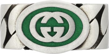 Emblematic interlocking-Gs pop against bold enamel on this Italian-crafted chain-design band done in sterling silver.