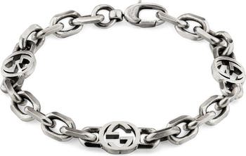 Three recognisable interlocking Gs are connected by a bold link chain on this sterling silver bracelet with a worn finish.