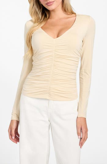 Ruching down the front creates a fitted silhouette in this long sleeve jersey top designed with a flirty dipped V-neckline.