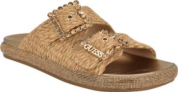 Shimmering metallic fibers and glittering crystal embellishment bring unexpected glamour to the laid-back resort vibe of this raffia slide sandal.