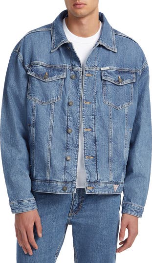 An oversized fit brings vintage style and layering ease to a nonstretch-denim trucker jacket made partially with recycled fibers.