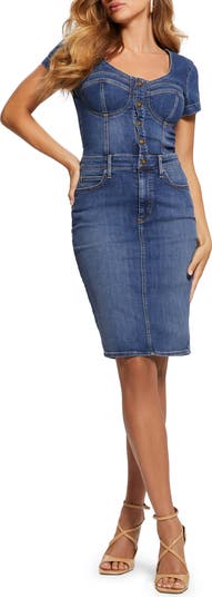 Move stylishly from day to night in this irresistible denim dress designed with a bustier bodice and abbreviated sleeves.