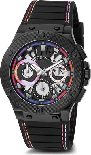 Ombré-color detailing pops against the matte black of this multifunction watch featuring three sub-eyes and a cutout dial for peeks into the inner workings.