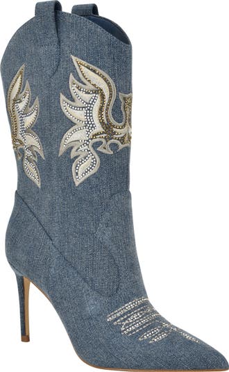 A pointy toe and stiletto heel kick up the style of this Western denim boot sparkling with metallic embroidery and rhinestone details.